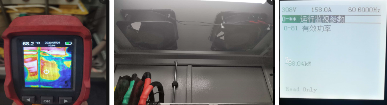 發(fā)電過(guò)程中變頻器有效功率為負(fù)值,濾波器線(xiàn)圈部分流過(guò)電流大,發(fā)熱量大,因現(xiàn)場(chǎng)并柜無(wú)法在左右兩側(cè)加裝對(duì)流風(fēng)扇,只能在柜頂加裝風(fēng)扇散熱。
