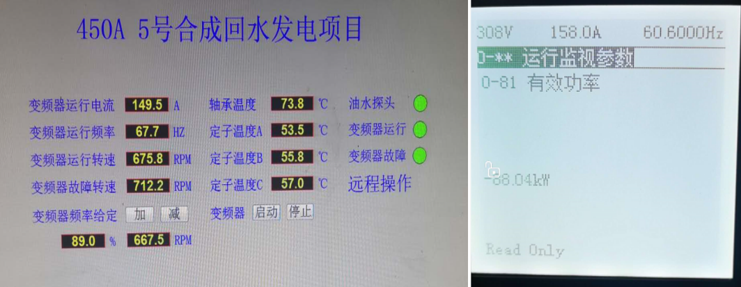 理想狀態(tài)下(水塔高10m,水流量每小時(shí)4000立方至5000立方),根據(jù)掛在進(jìn)線(xiàn)電源的前端的電度表顯示,四象限變頻器機(jī)組每小時(shí)向電網(wǎng)輸送電力在80-90KW左右,(變頻器在滿(mǎn)載情況下本身?yè)p耗不超過(guò)3%)