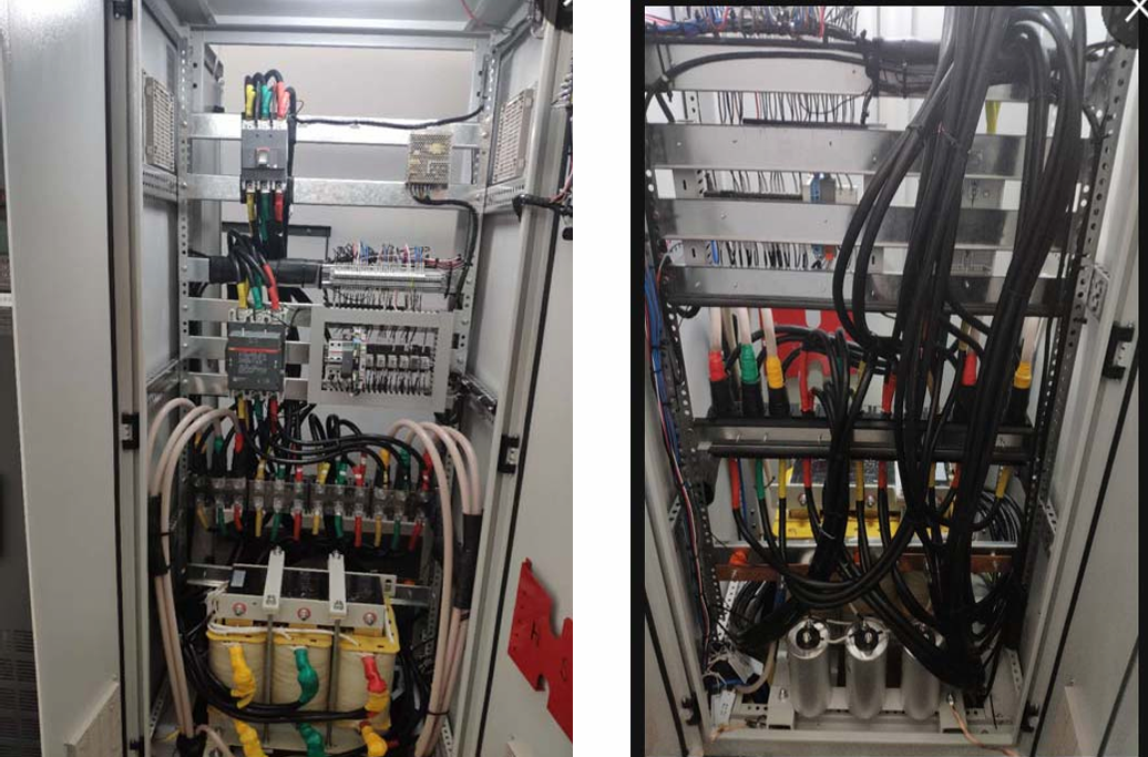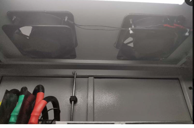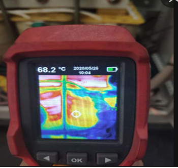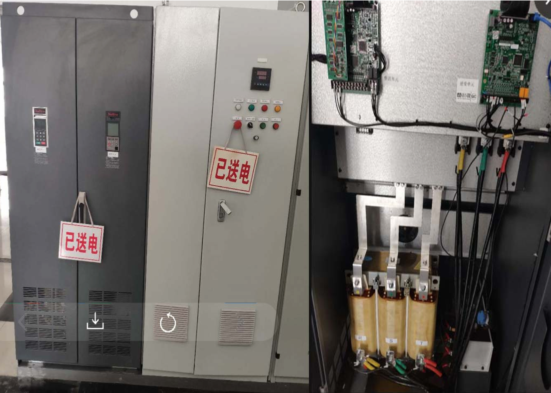 發(fā)電過程中變頻器有效功率為負值,濾波器線圈部 分流過電流大,發(fā)熱量大,因現(xiàn)場并柜無法在左右 兩側(cè)加裝對流風扇,只能在柜頂加裝風扇散熱。 柜內(nèi)溫度30度左右,線圈部分70度左右屬于正常情況。