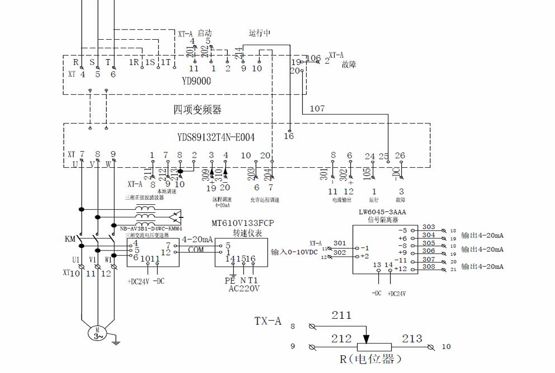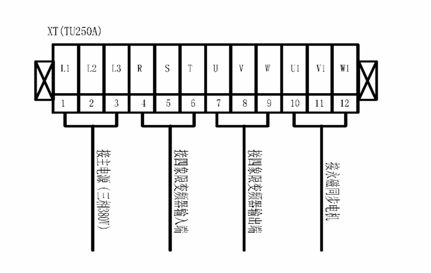 電機額定電流為194A,電機轉(zhuǎn)速750轉(zhuǎn),額定扭矩1680NM, 額定功率132KW。配電房和水塔電機之間的線纜超過150m。 根據(jù)電機的型號,我司選擇了額定電流250A的132KW四象 限變頻器。 為了減少輸出電纜上和電機中的脈沖電流,延長電機壽 命,在變頻器與電機之間使用更長的電纜連線,所以我 司選擇在變頻器和電機之間加裝正弦波濾波器。