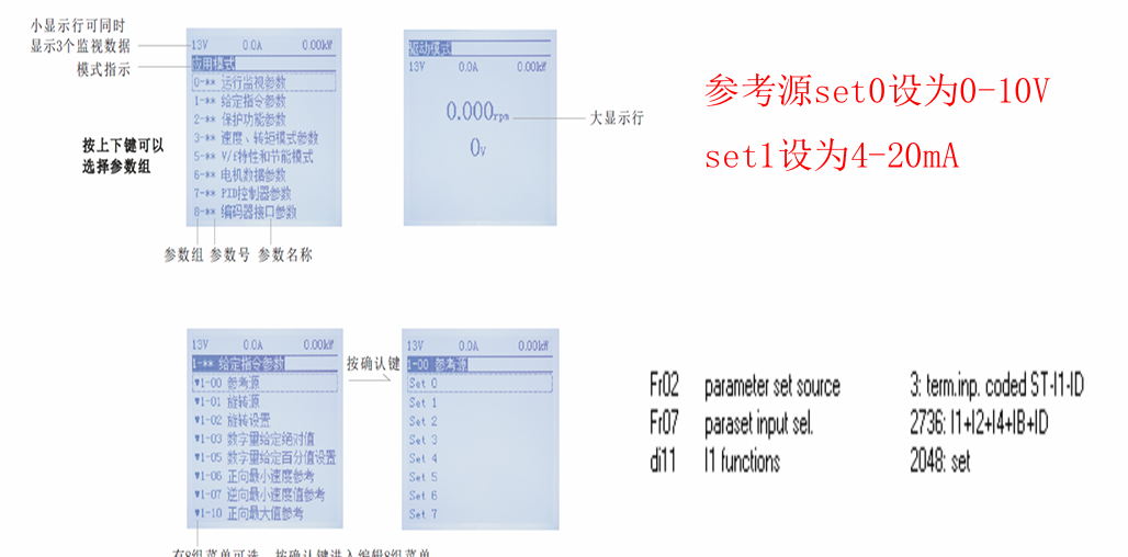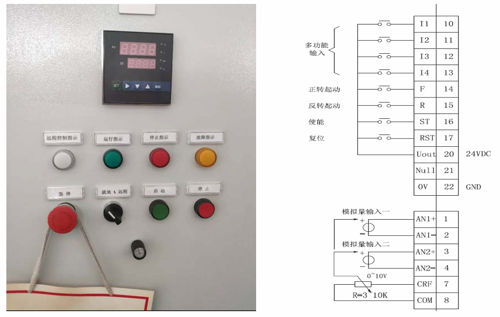 模擬量輸入1通道接本地電位器,模擬量輸入2通道接遠程4-20mA。 通過端子I1和公共端閉合來實現(xiàn)通道1和通道2的切換。