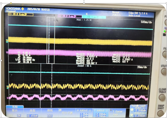 黃色為55kw主變頻器R相進(jìn)線電流波形(測是否干擾)
